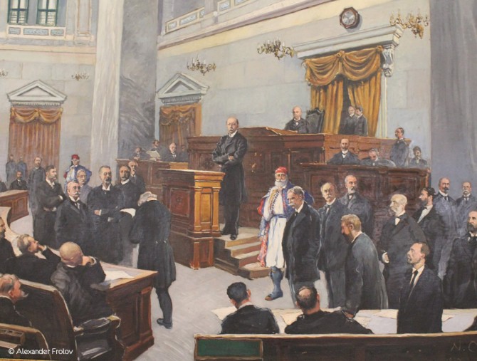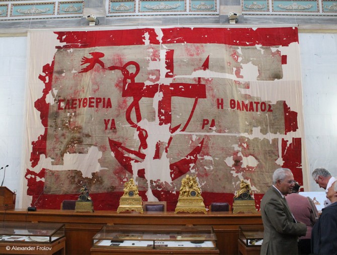 Еще одна немаловажная деталь выгодно отличающая исторический музей - место. Расположен он в бывшем здании греческого парламента. Первоначально это была усадьба афинского магната Контославлоса, но в 1833 году король Оттон выгнал оттуда ее владельца и сделал своей резиденцией. После восстания, которое заставило Оттона предъявить конституцию, здесь впервые было созвано национальное собрание. Далее последовали пожар и полная реконструкция. Нынешний облик здание обрело (а проект много раз менялся) в 1871 году, а до тех пор парламент заседал в наскоро выстроенном здании напротив, которому в народе было дано прозвище “барак”. В общей сложности парламент Греции тут “квартировал” с 1875 по 1935 год. В наши дни можно запросто присесть в кресле парламентария - примерить на себя роль депутата принимающего важные решения, а их, решений, в этом зале было принято немало. Кстати, сидения очень добротные.