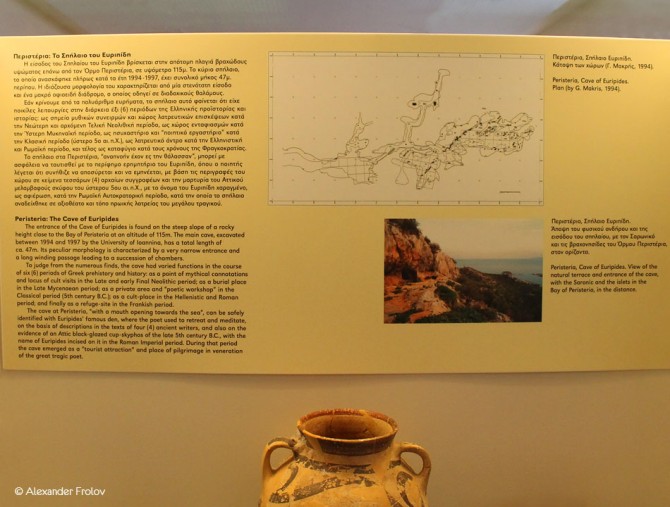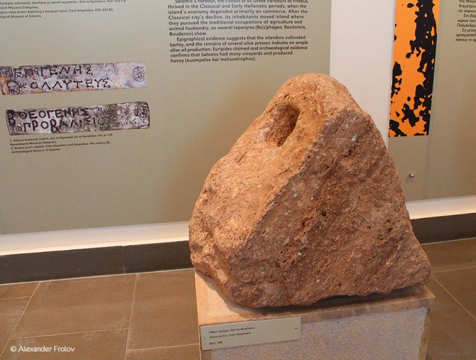 В первом зале можно видеть керамику доисторического времени, во втором – находки, датируемые геометрической эпохой (ее еще называют «Гомеровской Грецией», ок. 1050 г. до н.э.—VIII в. до н.э.). Далее, следуют мраморные надгробия, которые датируются классической, эллинистической и римской эпохами. Остальная же часть музея полностью посвящена знаменитому Саламинскому сражению состоявшемуся 22 сентября 480 г. до н.э. буквально в двух шагах отсюда. Например, тут можно увидеть якори используемые в то время греческими кораблями и, конечно же, многочисленные карты и схемы, делающие наглядным ход битвы.