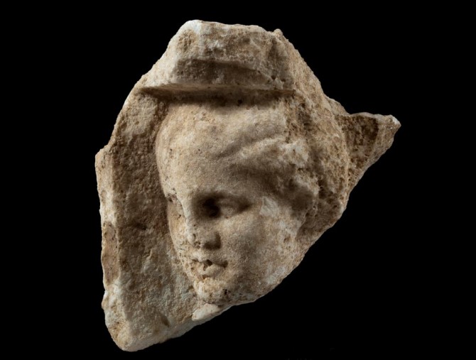 01: Паннель кессона, украшенная рельефом мужской головы. Найдена на потолке крыльца зала поющих танцоров. 340-330 годы до н.э.
