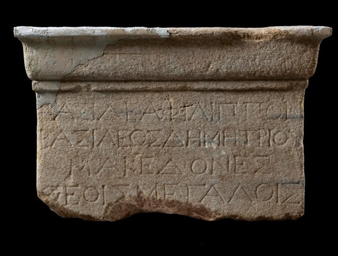 03: Base bearing the bronze statue of Philip V of Macedon. The inscription states “The Macedonians dedicate the statue of King Philip, son of King Demetrius, to the Great Gods” (Around 200 BC)
