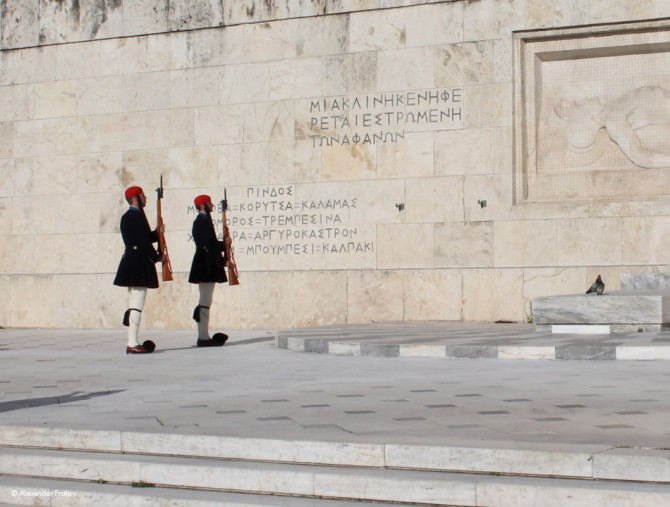 Наверно, у каждого народа есть национальные святыни, "демонстративно" охраняемые солдатами, одетыми в экзотическую форму. Это живая воплощенная история. О многом может рассказать место, где они несут свою службу, их форма, их церемониальные движения. Например, в Англии – это бифитеры (beefeaters), стражи лондонского Тауэра и королевские гвардейцы (bearskins), в высоких медвежьих шапках. В Греции – это эвзоны.