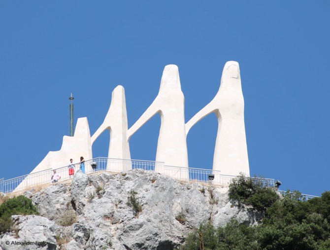 It is one of the historical mountains of Greece. It is located north of the city of Preveza and belongs to Kasopaion mountains of Epirus. Its name was associated with the pre-revolutionary period of 1821 and particularly with the legendary dance of Zalongo: In 1803, after years of battles against Ali Pasha, the people of Souli agreed to abandon their village, provided that the Turks would not hurt them. They were divided in three groups, one of which headed to Zalongo. Ali Pasha though did not respect the agreement and he attacked them fiercely there. Many of the people of Souli were captivated or killed. A group of about 60 women along with their children, in order to avoid the disgrace, resorted to the edge of a cliff, called Stefani. When the Turks approached, they decided that they would die as free women. They held hands and started dancing. After pushing their children downwards into the abyss, they also jumped, the one after the other, off the rocks and died. Today a memorial stands there to remind us their courage and their glorious death. It was unveiled by the Queen Frederika on 06/10/1961 and it was designed and built by the architect Patroklos Karanikas and the sculptor Giorgos Zongolopoulos. The memorial consists of 4,500 volumes of whitish limestone, dimensions 40x20x25 cm and frame of reinforced concrete. It is visible from Preveza (25 km away).
