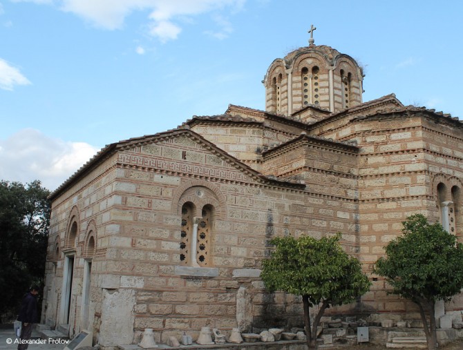 На территории Древней Агоры в Афинах есть только один памятник византийского периода - это Храм Святых Апостолов. Построен он был приблизительно в X веке на руинах Нимфея (частично) - древнего святилища нимф (II век н.э.) . Однако в основе восточной части храма лежит фундамент обычного жилого дома, который был снесен специально, чтобы освободить место под строительство храма. Место для возведения храма было выбрано неслучайно: оно было ключевым как в классическую эпоху, так и в византийскую, расположено оно в западной части Панафинейского пути и защищено городской стеной. План Храма Святых Апостолов состоит из четырех колонн, поддерживающих купол над крестообразным зданием. Окончание "креста" представляют собой полукруглые ниши. Между нишами оборудованы раковины. Таким образом неизвестный архитектор пытался усилить ощущение единства внутри храма.