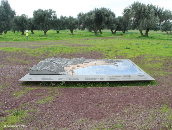 In a plain of Marathon, surrounded by lush greenery filled with olive trees, the Tumulus of the Marathon Warriors stands there for centuries to remind us one epochal battle. In 490 BC, during the course of the first Persian attempt to invade Greece, the mighty army of the Persians was intercepted by 10,000 Athenians and 1,000 men from Platees in the famous battle of Marathon, which, according to the historians, is considered one of the most important battles in the story of humanity. 6,400 Persians and just 192 Athenians were killed in the battlefield. The Athenians burned, according to the custom, the bodies of their dead and raised upon the ashes a large earthen mount, height of 9 meters and diameter of 50 meters. For the next many centuries, the Athenians kept honoring their dead, by organizing annual funeral games and torch races, while the Athenian teenagers laid wreaths outside the Tumulus and offered sacrifices in the memory of the brave warriors. The legend says that this place was haunted for many centuries and that every night the clash of the weapons, the cries of the battle and the neighing of the horses could be heard. The excavations of Valerios Steis in 1890/91 brought to light the cremated bones, the vases of the fire which covered the whole surface and of the pit on which the offerings were deposited. The exhibits are now presented in the Archaeological Museum of Marathon and the National Archaeological Museum. Outside the archaeological site of Marathon, there is the impressive statue of Miltiades, the great Athenian politician and General who led the Athenians to this amazing victory. The statue was created by the sculptor and painter of the School of Fine Arts in Athens, Antonis Ntagadakis, 2,500 years after the epochal battle of Marathon.