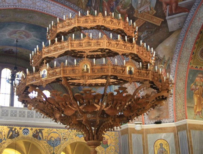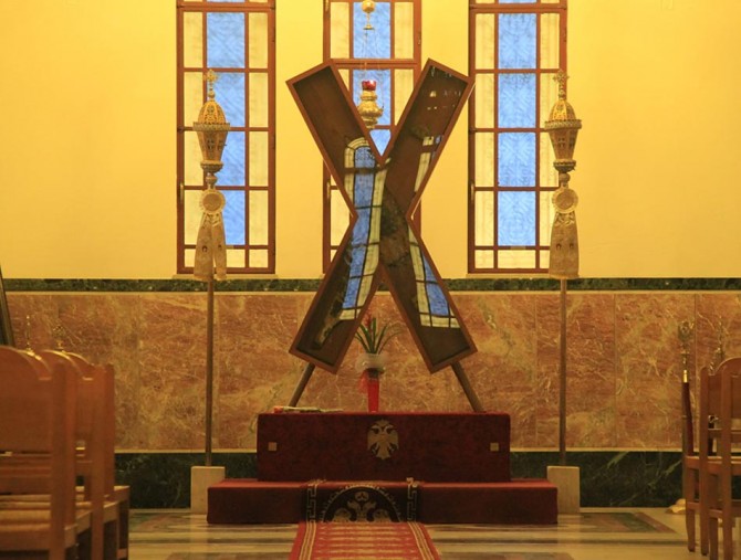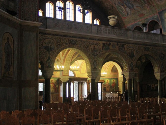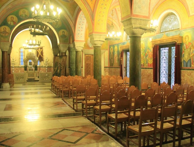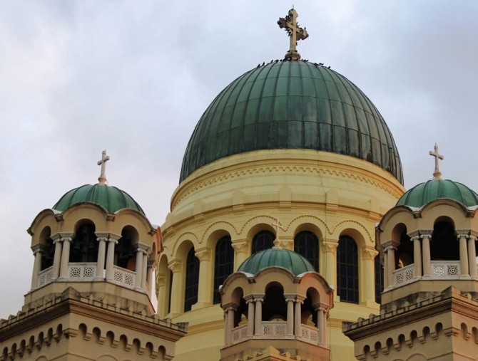 The temple is of Byzantine style. What characterizes it is the gilt cross of five meters high which stands on the main dome of the church (45 m. high). This cross symbolizes Christ, while the other twelve smaller ones symbolize his twelve disciples. The holy skull of the saint is being kept in the church since 1964, when they transported if from Italy.
