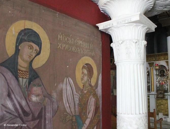 The church is a simple four-columned cruciform with a raised dome and was initially dedicated to Saint Theodore, but it was renamed to Agia Aikaterini, when it became dependency of the Imperial Abbey of Justinian. Apart from the wonderful Byzantine murals in the interior, the Church of Agia Aikaterini also features great portable icons, such as the ones of John the Baptist (Cretan School of the 15th century), of St. Catherine (Agia Aikaterini) (folk style of the 17th century), of the enthroned St. Catherine (representative sample of folk art during the Turkish Occupancy) and of Saint Spiridon (Ionian School of the 18th century). In the church also holy relics are being kept, that were brought by the refugees of Asia Minor.