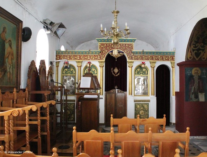 Помимо интересных византийских фресок, интерьер храма изобилует большим количеством небольших, но выдающихся икон. Это - относящаяся к Критской школе икона Иоанна Крестителя XV века, а также икона Святой Екатерины XVII века, выполненная в народном стиле. Последняя считается типичным образцом иконописи времен турецкого господства. Не менее интересна икона Святого Спиридона XVIII века Ионической школы. Помимо икон в храме хранятся Святые мощи, привезенные в начале прошлого века беженцами из Малой Азии.