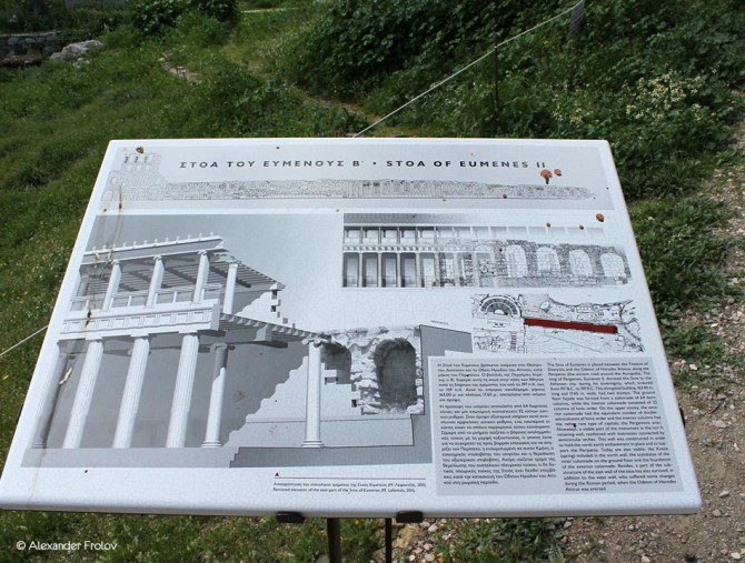 The Stoa was a two-storey building, with a length of 163 m. and a width of 17,65 m. The facade of the ground floor was formed by a colonnade of 64 Doric columns, while in the middle of the range there was a series of 32 Ionic columns. The Stoa of Eumenes is very similar to the Stoa of Attalus in the Ancient Agora of Athens, probably because the second one was a gift of the brother of Eumenes B’, Attalus B’.