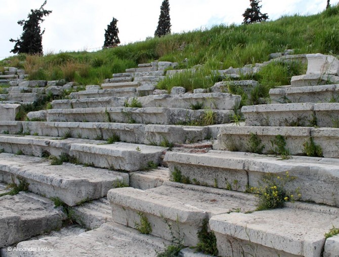 The story of the theater began after the construction of the archaic temple of Dionysus (in the second half of the 6th century BC), when the Athenians flattened a circular space, on the hillside of Acropolis at the north of the temple, in order to officiate the religious events in honor of the god. In the beginning, the spectators were sitting on the ground on the slop of the hill around this circular space (known as orchestra), but later wooden seats were added. Just for the record, the Tragedy was born from the circular dithyrambic dance of the worshipers of Dionysus.