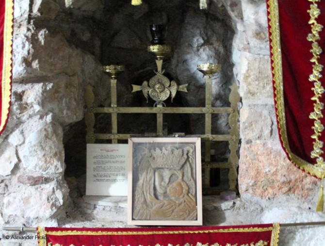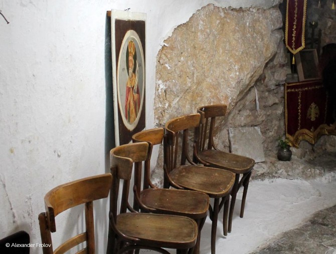 Its name to begin with, Panagia Katakekrimmeni (katakekrimmeni in English means something like “Very Well Hidden”), derives from the wonderful icon of Virgin Mary, which was hidden in the cave of the rock (over which the church was later built) and was found in a miraculous way. According to the tradition, either a powerful sparkle in the middle of the night leaded the Christians to this spot or a faithful man saw a relative dream and leaded the priests there. In any case, after they found the icon, they decided to build there a church. Today, the miraculous icon is placed in a wooden carved canopy inside the church and it is considered as an excellent sample of hagiography. The monastery is also known as Portokalousa (something like “Lady of oranges”) due to the old local custom according to which the villagers were throwing oranges to each other and especially to the newlywed couples on the day of the Presentation of Virgin Mary (November 21).