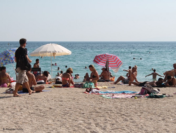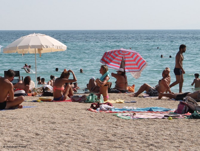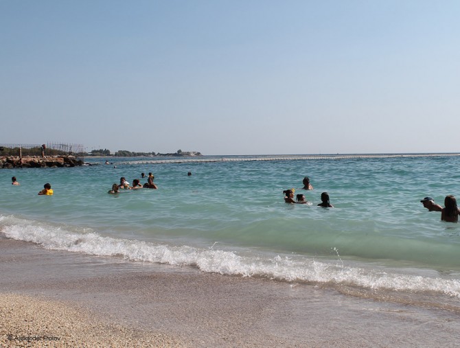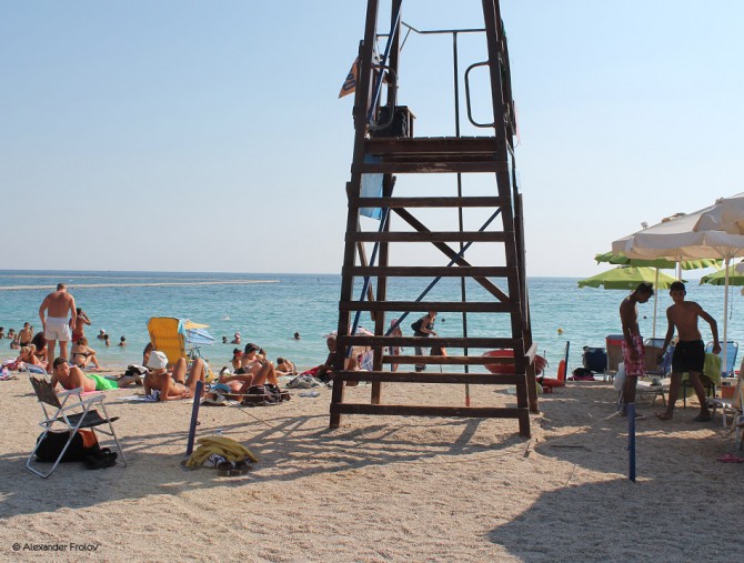 У купальщиков, как и у теннисистов есть предпочтения относительно “покрытия”. У теннисистов - это трава, грунт, синтетика. У любителей пляжного отдыха - песок, галька + “прямой” спуск в воду, т.е. по лесенке. Так вот пляж Каламаки - это галька. Причем довольно чистый! И, учитывая, что это только четвертая остановка трамвая после спуска к морю, вариант возможно чуть ли не идеальный. Для любителей гальки, разумеется. А галька, кстати, хороша тем, что можно лежать на ней без всякого полотенца - не вымажешься как в песке.
