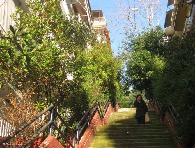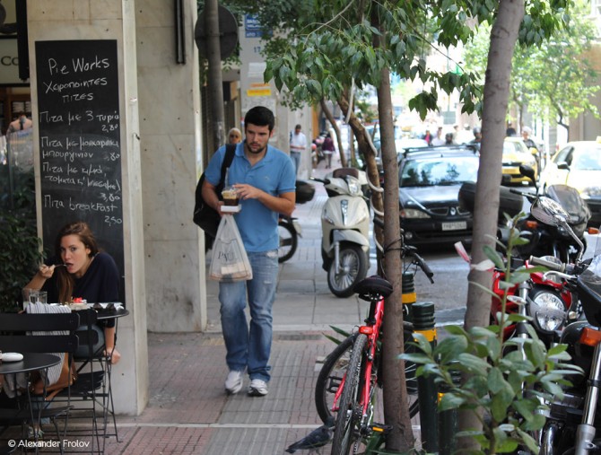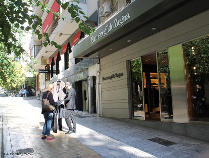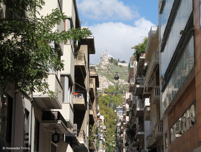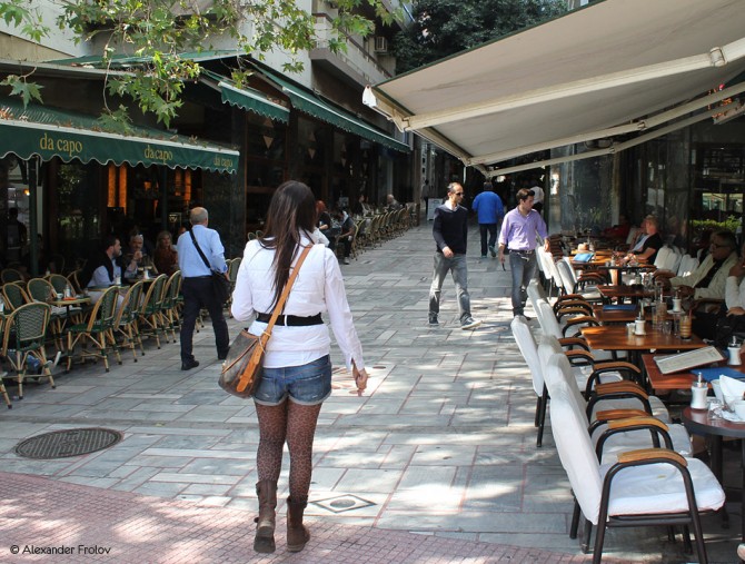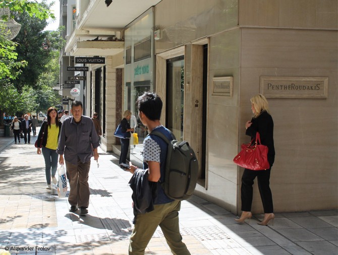 Расположенный у подножья горы Ликавитос афинский район Колонаки место солидное. Во всех смыслах. Облупленных зданий, равно как и иммигрантов, тут не увидеть. А увидеть можно чинно сидящую в кафе респектабельную публику - примерно таков был образ капиталистического общества в советские годы. Тут же и самые дорогие магазины в городе - можно посмотреть, а вот потрогать уже сложнее. Примета времени - люди небольшого достатка прогуливаются мимо витрин разговаривая по мобильному, а между делом разглядывают люксовые товары - не глазею я, по телефону разговариваю. Тротуары чисты настолько, что не грех и присесть - это вам не Монастираки с Омонией, хотя и они когда-то были не хуже. Впрочем, именно поэтому это место избегает модная небогатая молодежь - ее место в Гази или Псири. Древних памятников не водится, зато есть блистательные постройки в стиле конструктивизма 30х годов XX века. И конечно же гора Ликавитос, которая согласно преданиям была когда-то лишь камнем в руках богини Афины, выроненным ею в этих местах по неловкости.