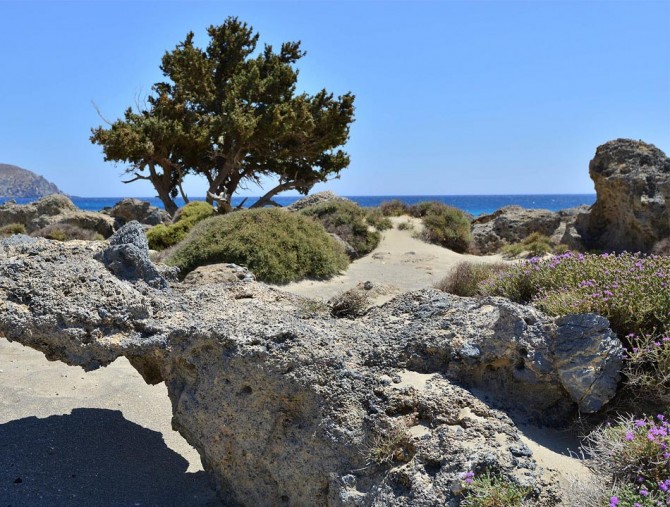 Kedrodasos is located at the south of Elafonisi and about 73 km southwest of Chania. The access is not exactly piece of cake, as you will have to drive on a dirt road after a point (or, if you do not mind the inconvenience, you can go on foot from Elafonisi). But the place totally deserves it. If you are brave enough to explore the area under the hot sun, you will also discover other smaller (and private) bays.