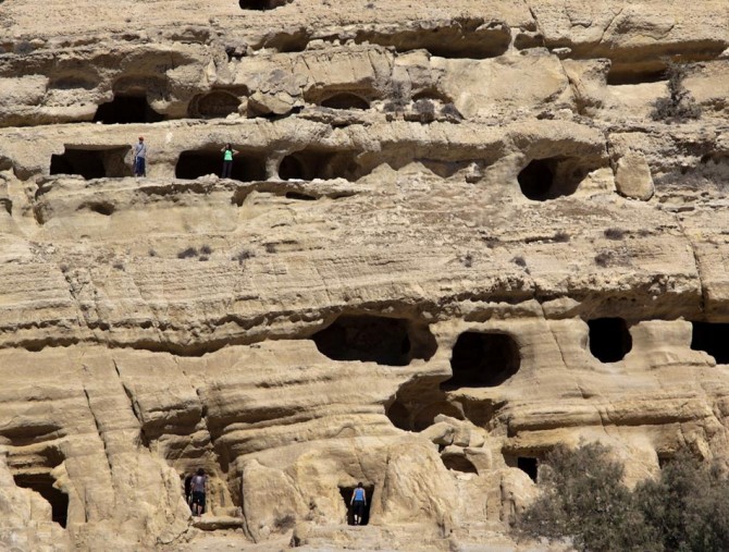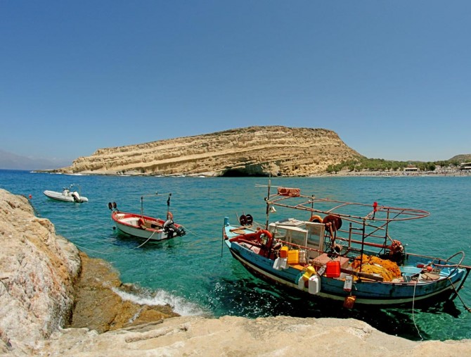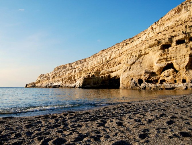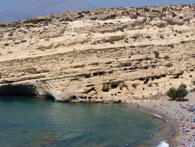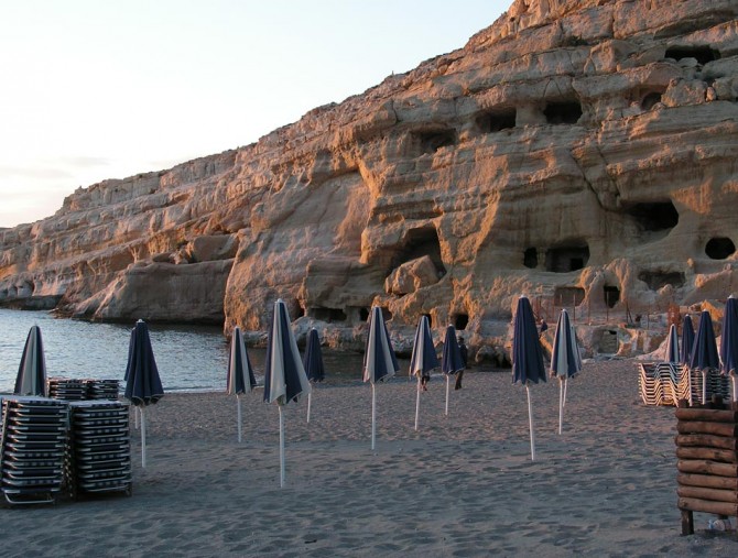 Once upon a time, Matala was the favorite hippies’ spot. During the 60’s, hippies from all over the world were traveling to this beautiful seaside Cretan village to live in the notorious artificial caves that are carved on the stiff rocks above the sea. They were living in peace, singing, dancing and enjoying the amazing sandy beach (one of the best of Crete). You could even spot famous music stars among the flower children, such as Janis Joplin, Joan Baez and Bob Dylan, while Joni Mitchell had mentioned Matala in the lyrics of one of her songs (“The night is a starry dome and they’re playin’ that scratchy rock and roll beneath the Matala Moon”).