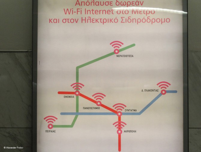 Бесплатный WI-FI доступен на многих станциях метро: Синдагма, Панапестимио, Акрополи, Омония, Пиреус и Дукиссис Плакентиас. А с июля WI-FI будет доступен вообще на всех линиях афинского метро а также в трамвае.